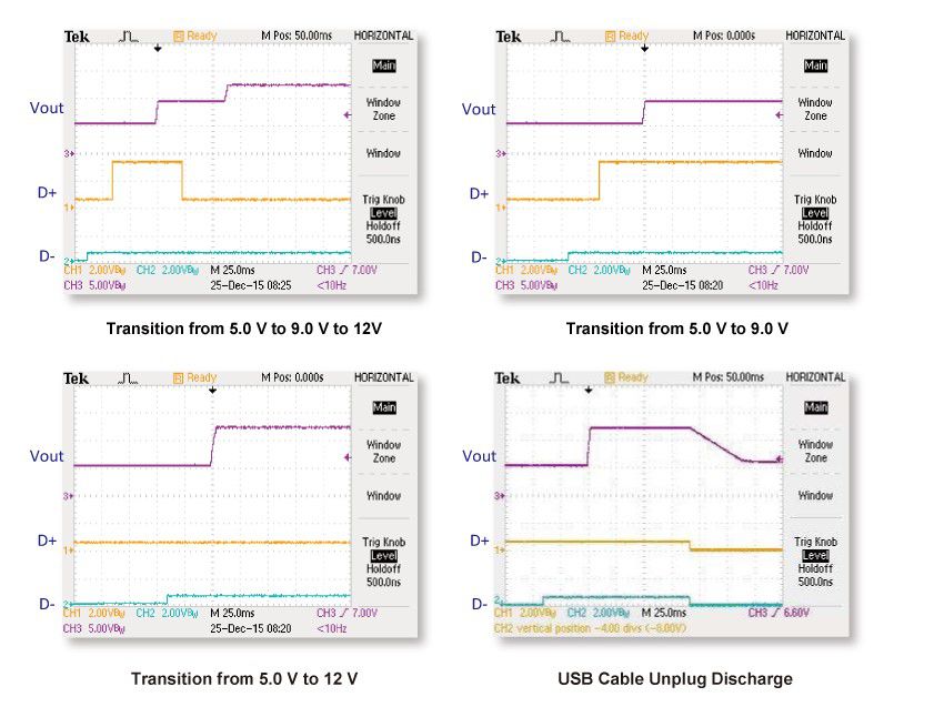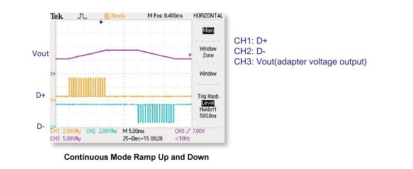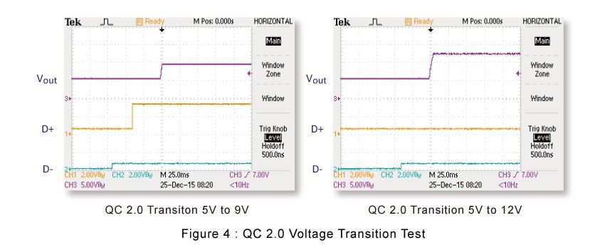 The difference between QC 3.0 and QC 2.0 is in increasing the voltage fine-tuning resolution. D + PULSE allows Vout voltage increases of 0.2V, D-PULSE allows Vout voltage reduction of 0.2V. Test results are shown below. 16 steps of D + PULSE increases Vout voltage by 3.2V while 16 steps of D-PULSE decreases Vout voltage by 3.2V.