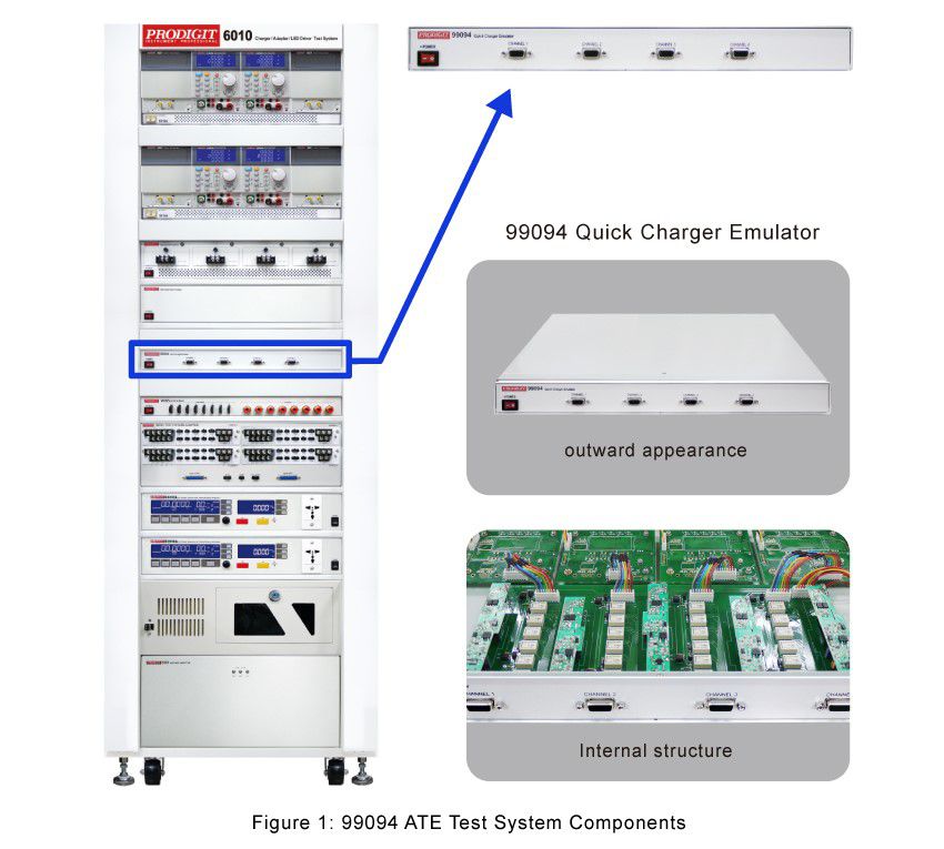 To support high speed testing of multiple intelligent quick charging products for mobile devices, Prodigit has developed the 99094 Quick Charger Emulator. This fully automated test system provides simulation of Quick Charger protocols for Pump Express and USB PD and other kinds of quick charging devices.