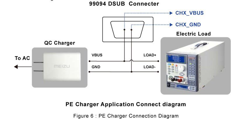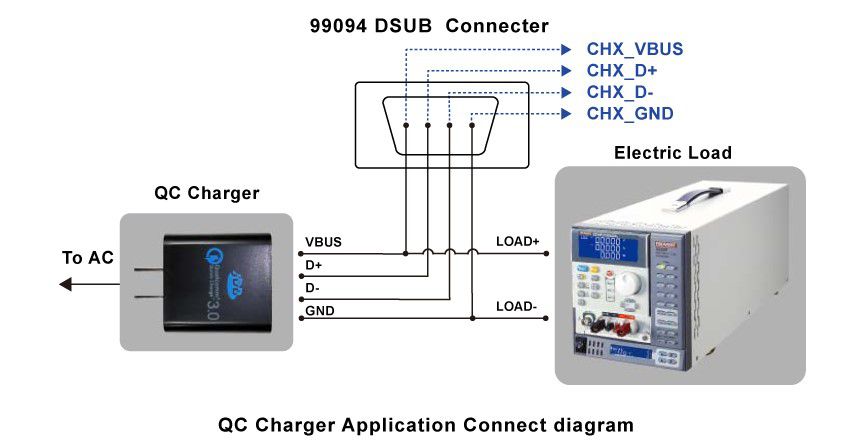 Prodigit 99094 Quick Charger Emulator used in the of 6010 ATE station can simulate the various voltage combinations of D +, D- for QC 2.0 testing to verify the output voltage of the test charger being tested. It also simulates the connection and removes the connection to the charger to verify that the charger can automatically change the high voltage output down to 5V. This verifies that the charger meets the Quick Charge 2.0 specification.