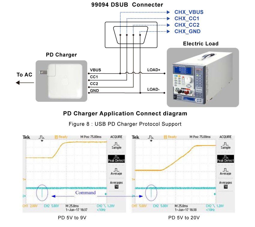 Prodigit’s 99094 4 channel Quick Charger Emulator in the 6010 ATE system includes four USB PD control chips that can simulate the device to verify and test the USB PD test procedures. All specifications of the power supply products can be tested easily by 6010 ATE, after programming all necessary test procedures in 6010 ATE. The operator can get test reports, effectively shortening the test verification time, to ensure compliance with the PD specification. See Figure 8