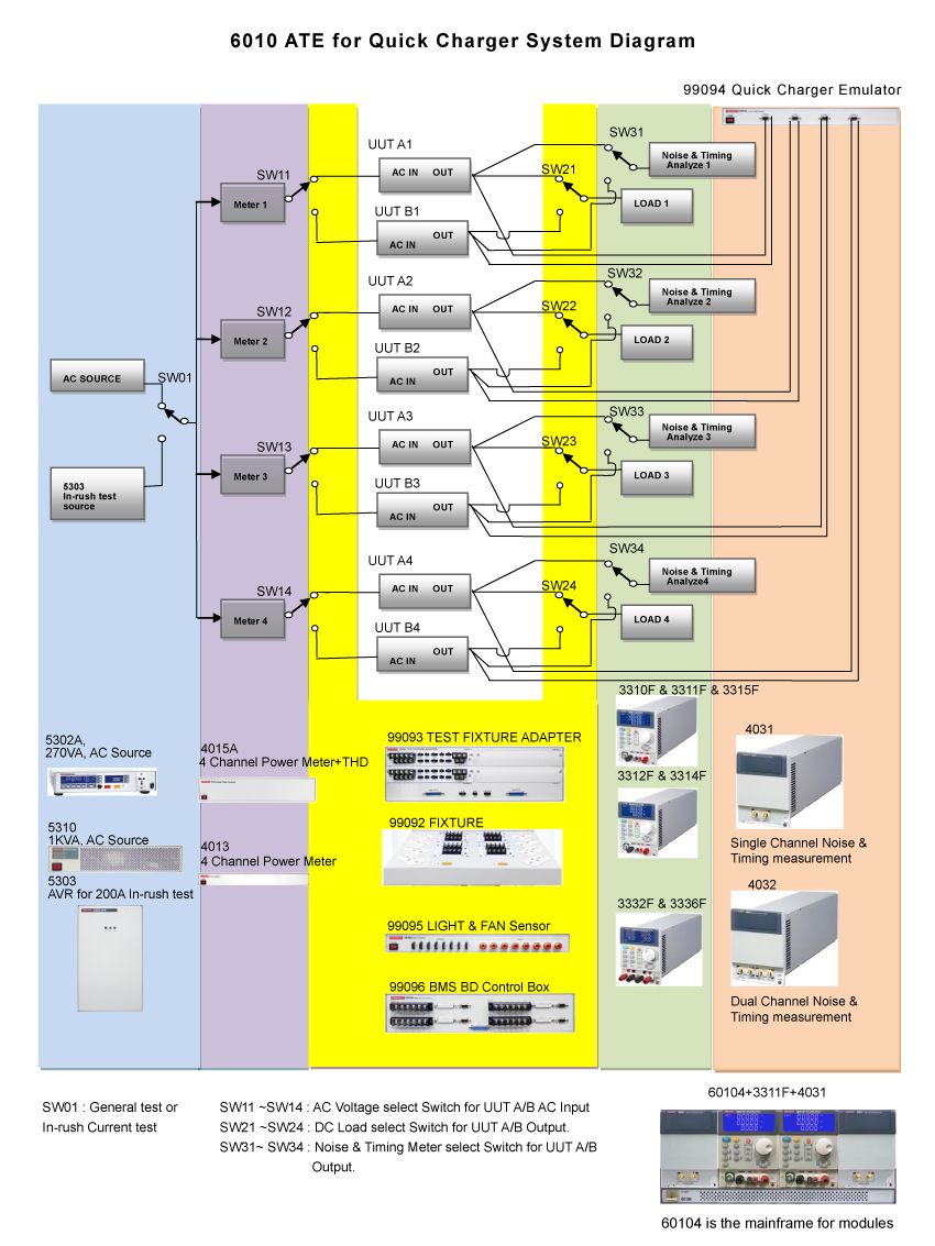 The 99094 contains a four channels quick charger emulator. The 6010 ATE system can simultaneously simulate four quick charge control signals for chargers aimed at mobile phones, tablets and notebook devices. A variety of quick charging technologies and protocols is supported to provide rapid testing and verification of this new generation of device chargers.