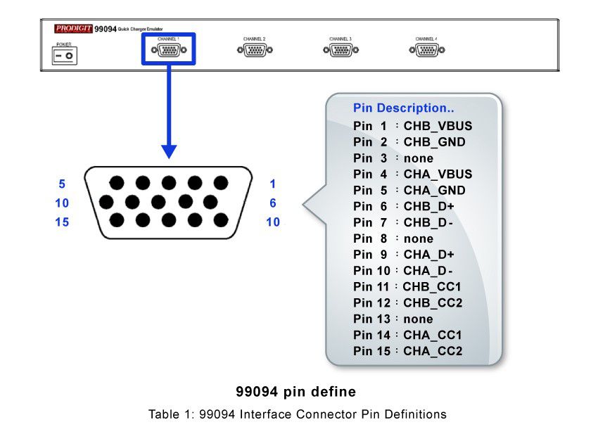 Each of the four 99094 emulator channels contains a 15 Pin interface connector, as shown in Figure 1. These connectors each include two sets of control signals (CHA and CHB) to support high throughput production line testing using dual A / B test fixture switching. Each connector pin assignments are shown in Table 1.