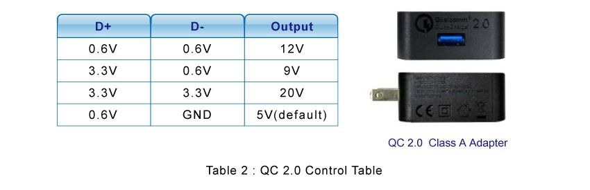 Specifically, Quick Charge 2.0 protocol provides output voltages of 5V, 9V, 12V and 20V and a maximum of 18W four voltage level charging. The QC 2.0 symbol is a lightning bolt plus a circle with a Class A or Class B indication as shown below. Class A supports three voltage levels (5/ 9/ 12V) while Class B supports four voltage levels (5/ 9/ 12/ 20V).