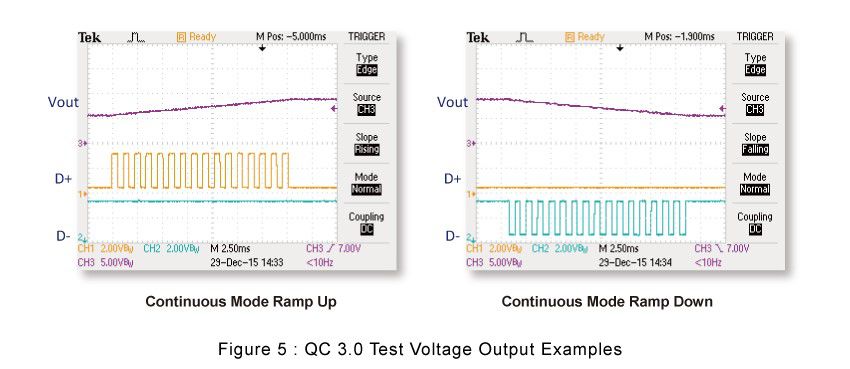 Prodigit 99094 is a 4 channels Quick Charger Emulator of 6010 ATE which is capable of simulating D +, D- pulse control to control 0.2V increments and decrements to verify and test the output voltage of the charger to ensure compliance with the Quick Charge 3,0 specification. Refer to the samples shown in Figure 5.