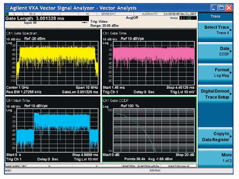 ● Powerful time gating: Besides spectrum, you can display CCDF, power spectral density, or auto-correlation measurements. Move the gate position during a paused measurement and the gated displays update immediately.