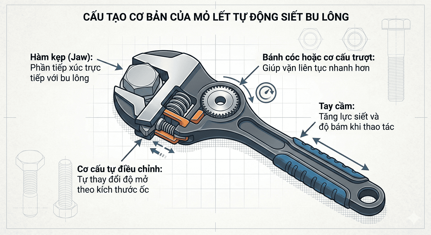 Jaw: The part that directly contacts the bolt. Self-adjusting mechanism: Automatically changes the opening size according to the bolt size. Ratchet or sliding mechanism: Allows for faster continuous tightening.