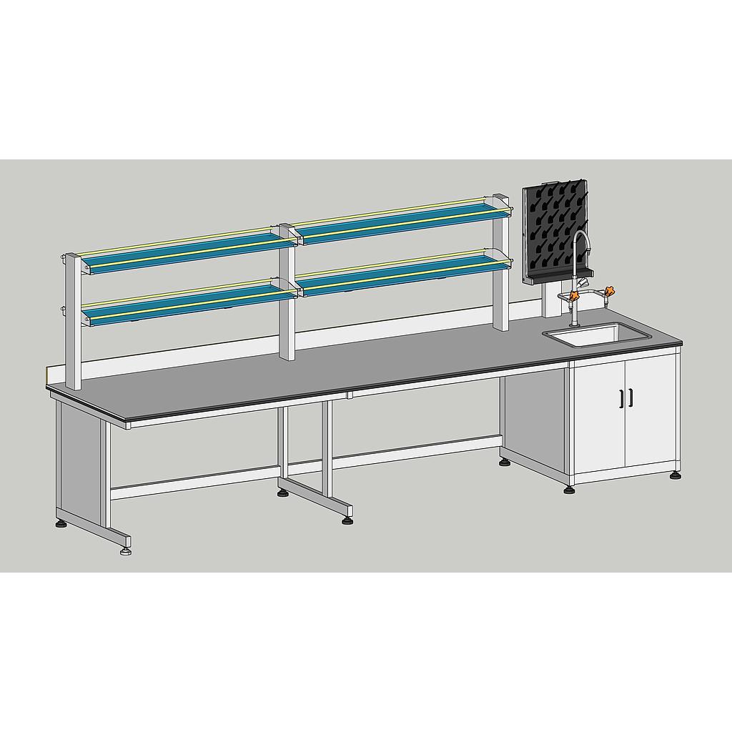 - Modular structure by 30x60 box steel system, 1.4mm thick, powder coated in light gray color, connected by industrial couplers- Includes: 1 sink cabinet (1 set of basin faucets), 6 electrical outlets, 1 stainless steel tool holder, 1 chemical storage shelf + two lights