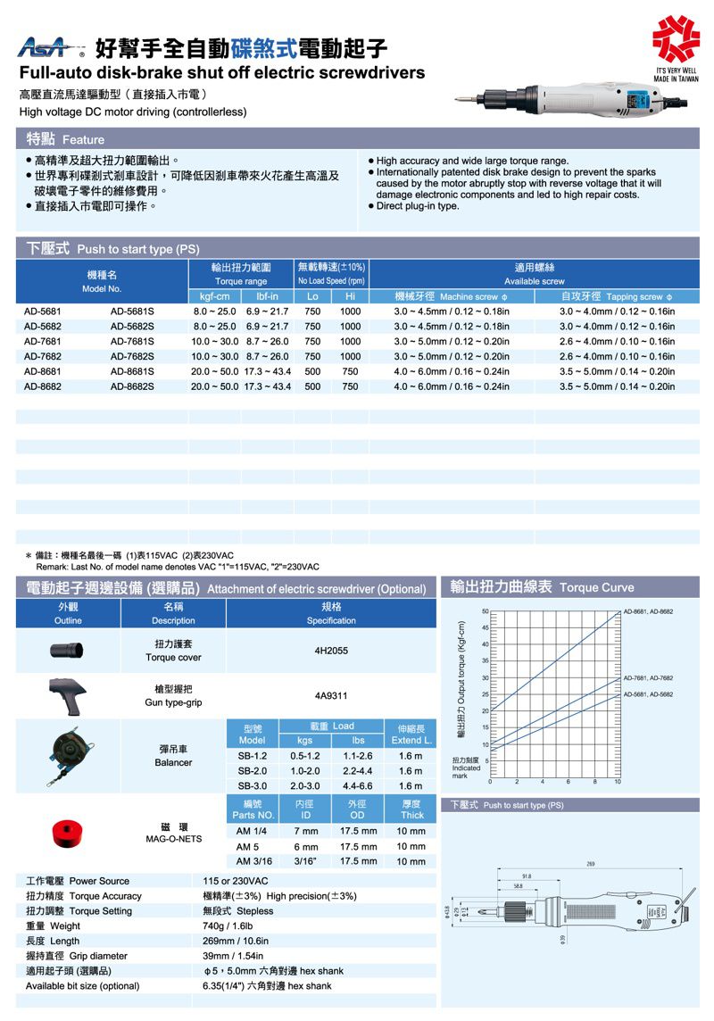 ASA AD-7682 Full-auto disk-brake shut off electric screwdriver - Push to Start Type (10.0-30.0kgf-cm, 1/4", Push to Start) | EMIN.CO.TH