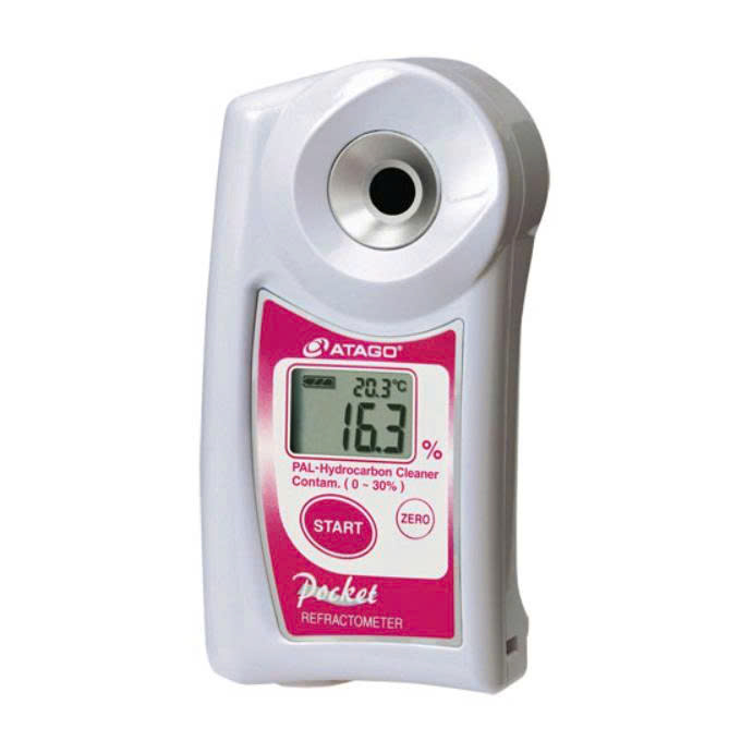 This instrument displays the Contam. (oil) % dissolved in hydrocarbon cleaner solution used in cleaning processes. If new cleaning solution is first measured and recorded on the instrument, then contaminated solution will display as "Contam. (oil)%." This measurement can be used to determine the timing of when to change (or distill) the cleaning solution.