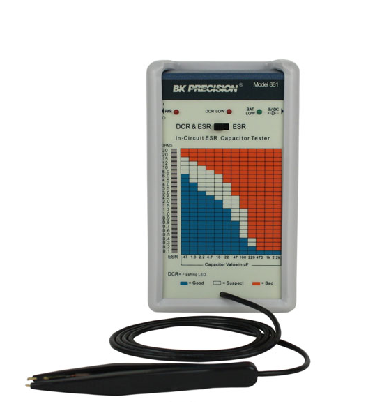 This in-circuit ESR & DC Resistance capacitor tester is specially designed to measure ESR (Equivalent Series Resistance) on capacitors in the range of 0.47uF to 2200uF, in or out of circuit. The ability to trouble shoot in-circuit saves time and makes the 881 a must for anyone that tests or trouble shoots printed circuit boards. - 100KHz Output test frequency - 15mVp-p Output test voltage (will not turn on any solid-state devices) - Automatically discharges the capacitor under test - Microprocessor controlled - One-handed tweezer test probe included - One year warranty