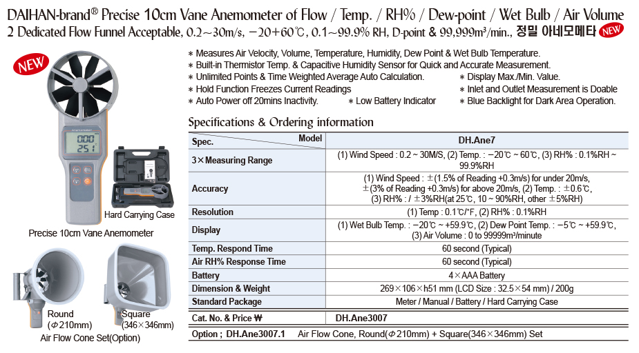 3x Measuring Range: (1) Wind Speed: 0.2~30M/S, (2) Temp.: -20°C ~ 60°C, (3) RH% : 0.1%RH ~ 99.9%RH