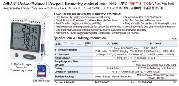 DaiHan THH9 Desktop/Wallmount Dew-point Thermo-Hygrometer of Temp·RH%·DP℃ (Temp·RH%·DP℃, SD card) | EMIN.CO.TH