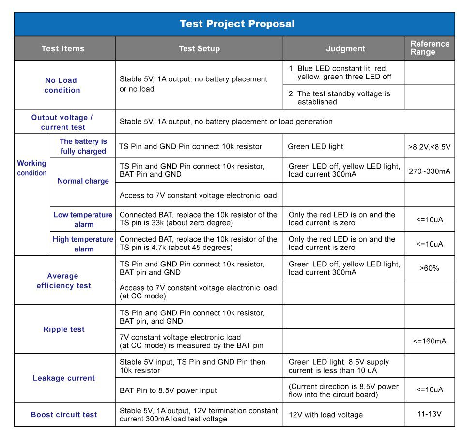 Prodigit’s new NTC simulator can simulate NTC resistance values change. Available ranges are from 100ohm-500Kohm, which is equal to - 46°C - + 179°C temperature range changes. The NTC simulator acts like a standard resistance box, consisting of a number of precision resistors, it can automatically output the required temperature resistance value. Thus, if the NTC simulator is connected to the NTC interface of the charger, it can simulate low temperature (0 deg C) or high temperature charging conditions. This enabled checking to see if the unit under test can stop charging according to the design criteria. Furthermore, it can also simulate when the temperature returns to the available temperature, such as from 0 deg C back to 5 deg C and return to charge normal charging. The following table shows the required general charger test items for temperature changes.