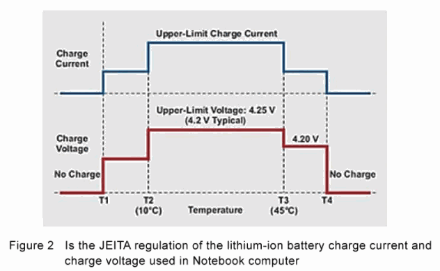 In an effort to improve the safety of lithium battery charging systems, JEITA and Battery Association of Japan issued safety regulations on April 20, 2007. This regulation emphasizes the need to avoid using high charging currents and high charging voltages in certain low and high-temperature ranges. The JEITA believes that lithium battery problems occur under high charge voltage and high battery temperature conditions. Figure 2 shows the JEITA regulation of the charge current and charge voltage at the battery temperature limits used in the notebook computer.