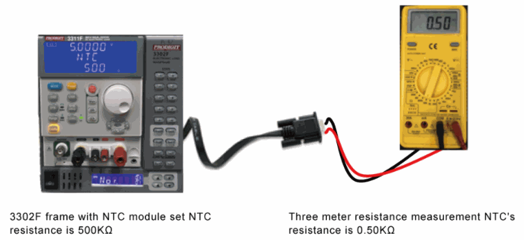 Set the NTC resistance value to 500ohm. The NTC output for the DSUB-1SPIN connector is located on the rear panel of 3302F electronic load chassis. Use a DMM meter to measure the resistance value between PIN9 and PIN11 at both ends of the DSUB-1SPIN connector. The set value is shown as {Figure left) and the actual measured value is shown as (Figure right).
