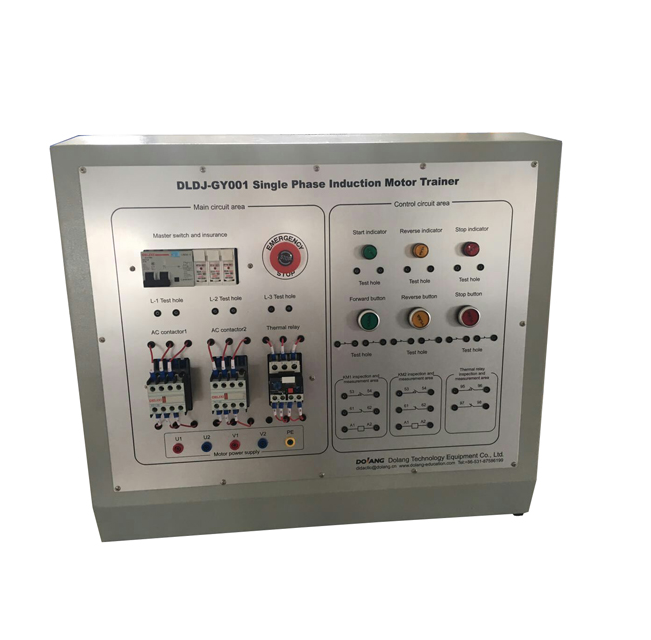 This Electrical Machine Trainer consists of Single - phase induction motor, power control part, fault setting .The single-phase induction motor is powered by the power area ,and the control circuit controls its motor movement,setting the fault point in the circuit by dialing the twist switch, and sets the detection function in the main circuit to allow the student to complete the troubleshooting.