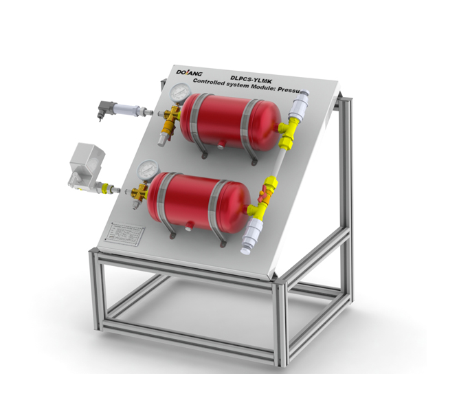 The panel is mounted on the frame of the base module DLPCS-JCDYP. DLPCS-YLMKconsists of two steel pressure tanks and is operated with compressed air as the working medium. Each tank is fitted with a manometer and a safety valve. One tank also has a drain valve. Both tanks can be fitted with a pressure sensor. The tanks are interconnected by a vent valve and can therefore be connected in series. This makes it possible to represent both first and second order pressure control systems.