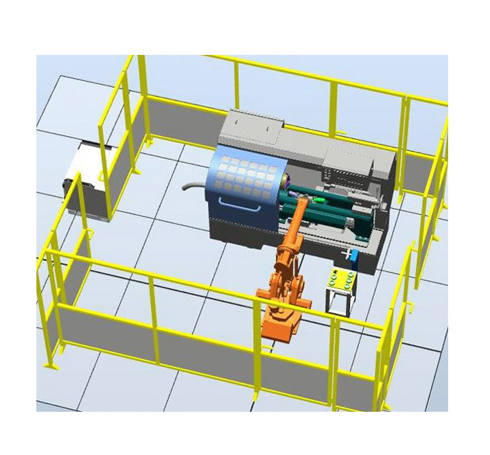 ●The robot will grab the workpiece which to be processed and put on the machine to process, after finishing processing, the robot will put the workpieces under the visual system to detect, according to the result put the qualified product to the qualified position, and put the unqualified product to the unqualified position.