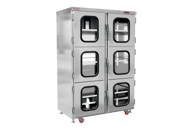 Dryzone Nitrogen desiccator cabinet is 1-50% RH adjustable and it has two series, one is the CQB series which is an ESD paint structure, and one is the CQS series which is stainless steel structure and CQS series could comply with clean room demand. Both series are equipped with QDN (nitrogen saving module). Our large nitrogen dry box desiccator features precise humidity and temperature control, reliable ESD protection, and low power consumption.