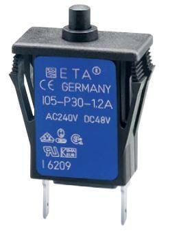 E-T-A Circuit Breakers 105-P10-0.4A Thermal Overcurrent Miniaturised single pole thermal circuit breaker with push-to-reset tease free, trip-free, snap action mechanism (R-type TO CBE to EN 60934) snap-in type. Manual release facility optional. Approved to CBE standard EN 60934 (IEC 60934