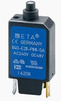 E-T-A Circuit Breakers 1140-E211-P1M1-5A Thermal Overcurrent Miniaturised single pole thermal circuit breaker with push-to-reset tease-free, trip-free, snap action mechanism (R-type TO CBE to EN 60934), integral type. For lower current ratings see types 104. Approved to CBE standard EN 6093