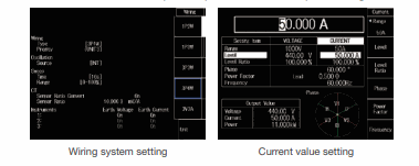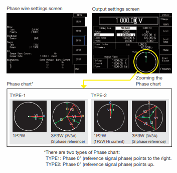 The LS3300 is equipped with a 5.7-inch color LCD. It shows the wiring and power settings, as well as the phase chart of the generated waveforms, allowing users to quickly and easily view the instrument settings (as seen below). Users are also be able to view the unit information such as the serial number, version information, and communication settings in the UTILITY menu. The values of voltage, current, active power and reactive power specified according to the level, level ratio and power factor are displayed as output values.