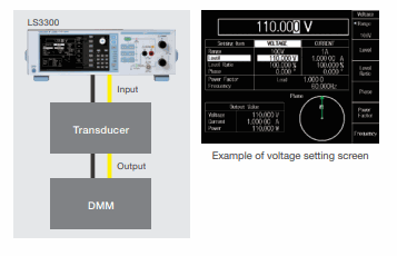 There are different kinds of power transducer instrumentation for AC voltage, current, active power, reactive power, etc. The LS3300 can perform highly accurate output (the voltage accuracy of 350 ppm and current accuracy of 450 ppm), output AC voltage/current separately and set the phase angle of power. With these features, it supports input/output characteristic adjustment and inspection in the power transducer production line and calibration inspection for periodic checkups.