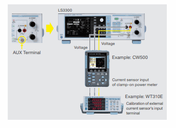 A large current sensor used for industrial equipment and a clamp-on power meter used to monitor energy-saving are widely used in the power measurement market. When a clamp-on power meter unit or external current sensor input (voltage output) is calibrated, an AUX terminal is used. The voltage output range of a current sensor signal (Ext. Sensor) is 0 to 6.25 V. Users can select either the 500 mV or 5 V range according to the output range of a current sensor.