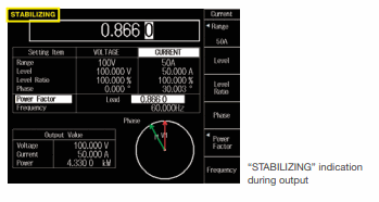 To improve working efficiency, the LS3300 is equipped with a function for notifying the user that the output is stable. When the STABILIZING indication disappears from the LCD two seconds later, it means that the output has become stable. This reduces time spent on working with transient signals that affect measurement accuracy.