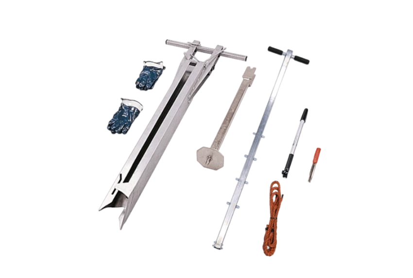 The peat profile sampler consists of a rectangular stainless steel box casing, divided lengthwise into two halves, with very sharp specially shaped cutting edges at the base.
