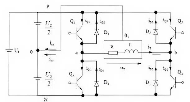 Semiconductor devices are used to reverse current direction in a controlled cycle. Switching speed and control sequence determine the resulting output waveform.