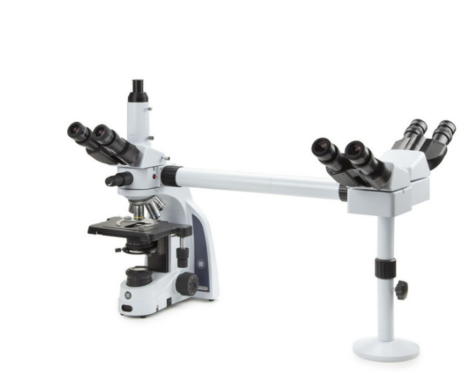 Trinocular version with 2 extra binocular heads. Siedentopf 30° inclined tubes. Interpupillary distance 48-75 mm with diopter adjustment on left tube.
