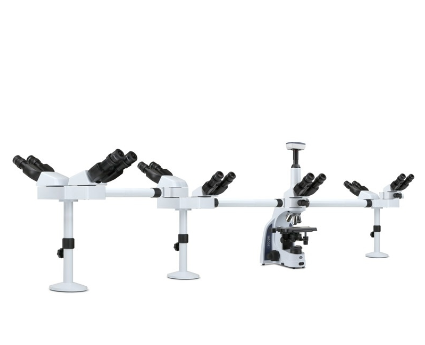 Trinocular version with 6 extra binocular heads. Siedentopf 30° inclined tubes. Interpupillary distance 48-75 mm with diopter adjustment on left tube.