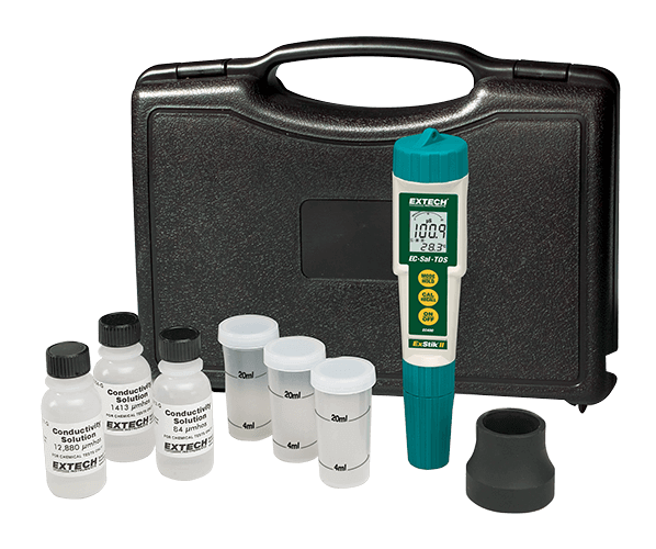 EC410 kit includes EC400 ExStik® Conductivity/TDS/ Salinity, Temperature Meter, with sensor, protective cap, 84μS/cm, 1413μS/cm and 12880μS/cm calibration standards (30mL bottle each), weighted base, 3 sample plastic cups with caps, four 3V CR-2032 batteries, 48" (1.2m) neckstrap, and carrying case