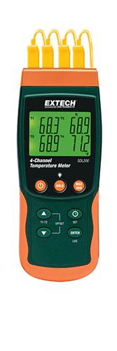 Complete with 6 AA batteries, four general purpose Type K bead wire temperature probes, SD card, and hard