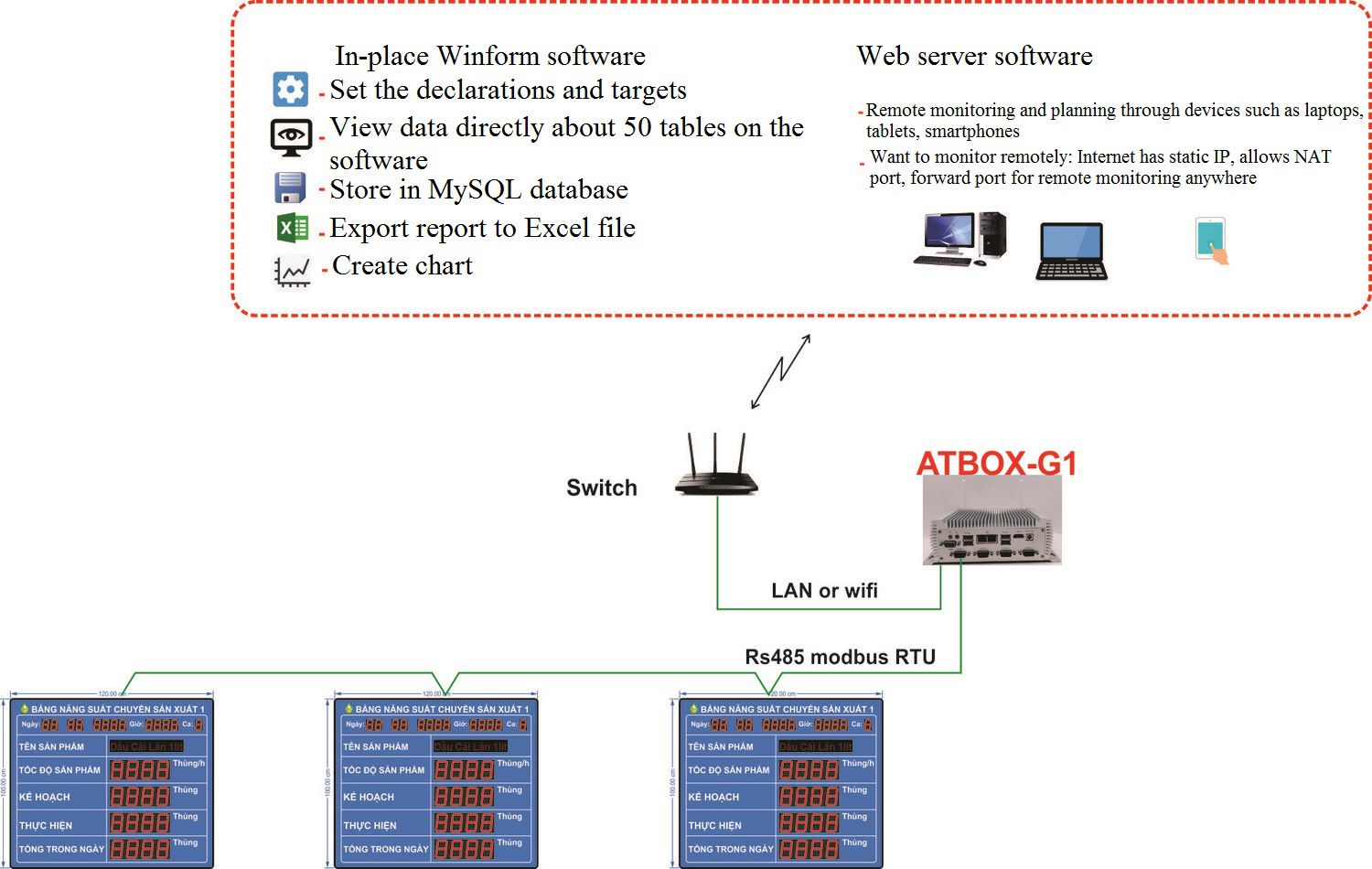 Information about manufacturing progress, quality tracking, operating duration of machines, actual production, overall performance,… is displayed on the VDU. The VDU is also engineered with eye-catching graphic, deploys customizable LEDs.