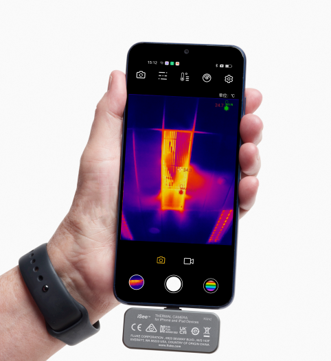 The Fluke iSee™ TC01C is designed for a variety of engineering applications. In the electrical industry, the camera identifies hot contacts in electrical panels, circuit breakers, or cable connectors. In mechanical and HVAC applications, the TC01C is used to check motors, pumps, bearings, or heat exchangers for overheating. In the building industry, it is used to evaluate insulation performance and detect energy loss in buildings. Its small size and ability to connect directly to a phone makes it convenient to operate in tight spaces or hard-to-reach locations without dismantling the system.