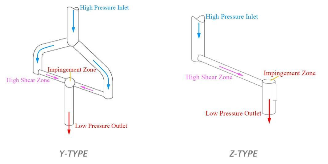 It has Y-Type and Z-type for different applications. The Y-type interaction chamber, is regarded as one of the most powerful homogenization chambers to date. In this system, the flow stream is split into two channels that are redirected over the same plane at right angles and propelled into a single flow stream. High pressure promotes a high speed at the crossover of the two flows, which results in high shear, turbulence, and cavitations over the single outbound flow stream.