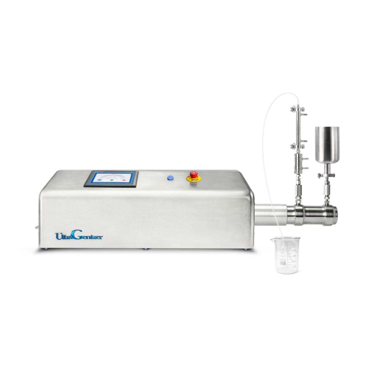 The UltraGenizer is a ultra-high-pressure homogenizer and cell disruptor suitable for larger flow rate requirements. The maximum pressure of the UltraGenizer is up to 60,000 psi. The UltraGenizer single pump system is smart and simple to operate, including a diamond interaction chamber to disrupt the cell and reduce the particle size. Regarding the sample cooling unit, a 316L stainless heat exchanger can be installed in the system to achieve real-time cooling on the samples. Additionally, the Genizer PLC touch screen creates a simple user interface for operators, including the access to the auto-stop setup (set time, cycles numbers, and pressure). All parts touching with medium are 316L stainless steel, 17-4ph stainless steel, titanium alloy, tungsten carbide, PTFE, UHMWPE or other corrosion resistance materials.
