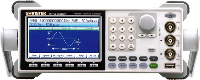 Waveforms: Sine, Square, Ramp, Pulse, Noise, DC, Sin(x)/x, Exponential Rise, Exponential Fall, Negative Ramp