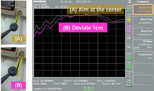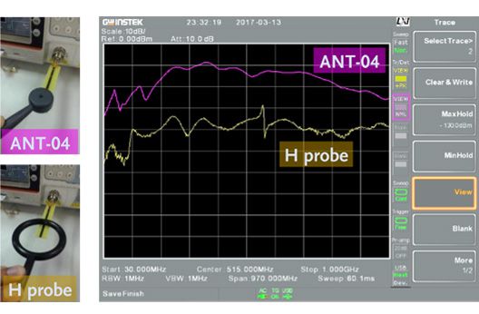 Moreover, in the process of EMI debugging, the problem of a magnetic field or an electric field must be considered to solve whether for isolation mechanism, filter circuit or grounding design of the circuit in terms of techniques and methods for solving the problem. The main method is to measure the frequency and amplitude (energy) of the EMI noise so as to confirm which circuit or component produces the interference signal source. The interference can be improved by suppressing the current (such as series resistance) or voltage (such as parallel bypass capacitor). Using the near field probe of GKT-008 to directly measure the electromagnetic energy can directly measure the actual near field electromagnetic energy. There is no need to measure the electric field and the magnetic field separately by using GKT-008, which becomes a more efficient tool. In some special applications, separate analysis of the electric and magnetic fields is required such as larger power motor rotation systems. | ||||||||||||||||||||||