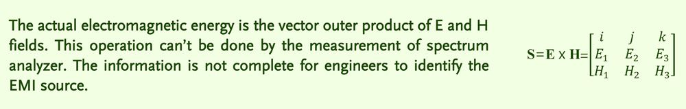 13. Is it better to use the H and E probes to measure the electric and magnetic fields of the EMI signal separately?Using the near field electric field probe and the magnetic field probe to measure the near field electric field and the magnetic field respectively can only obtain the two components of the electromagnetic energy in the EMI signal. The GKT-008 can directly and effectively sense the actual electromagnetic energy. The near field electric field probe and the magnetic field probe can only measure two components of the electromagnetic energy of the EMI signal. The actual electromagnetic energy is the vector outer product of the electric field and the magnetic field. Hence, the large near field magnetic field does not mean that it will radiate to become the interference of EMI. It is the same for the electric field. Therefore, measuring the near field electric field and the magnetic field is only a substitute method when the electromagnetic wave energy cannot be directly measured. Moreover, the electric field E and the magnetic field H respectively measured by the spectrum analyzer are difficult for the calculation of the electromagnetic energy vector by using the formula.