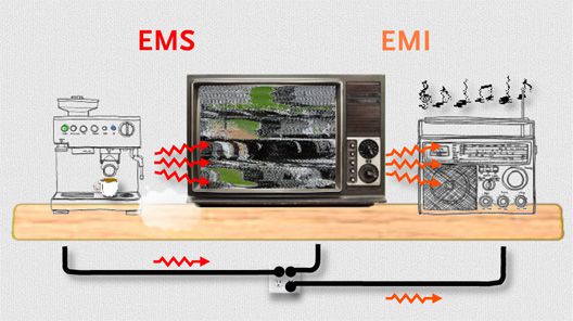 EMC includes EMI and EMS. EMI is the self-emitted noise poses impact on other electronic devices, and EMS is affecting electronics products by surrounding electronic devices' noise.