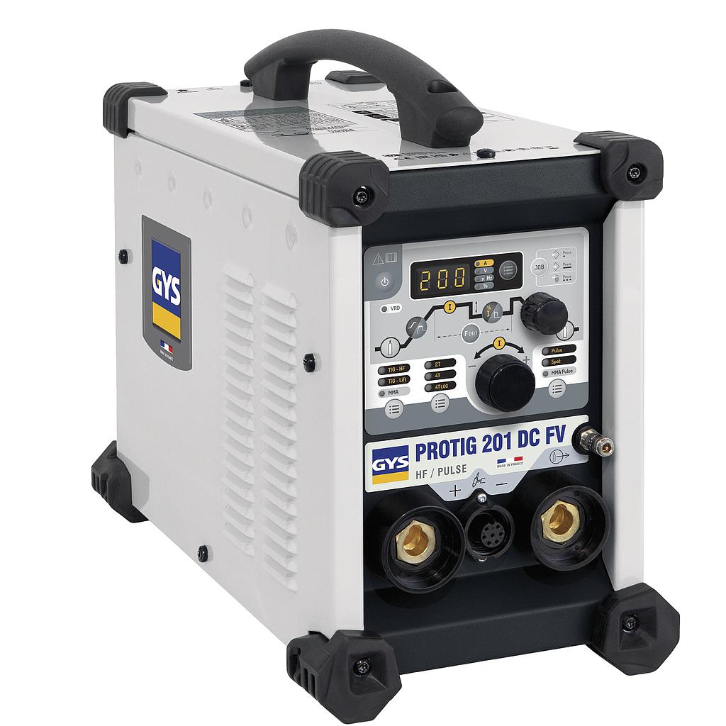The PROTIG 201 DC FV (200 A) ensures high quality welds on mild and stainless steels thanks to its secondary regulation, its PFC power supply and its powerful HF ignition.. Its intuitive interface makes it easy to modify the parameters.