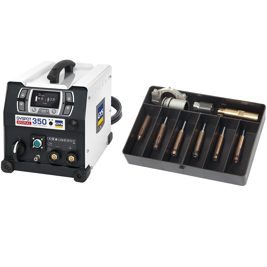 The GYSpot ArcPull 350 is an arc-drawn welding machine designed for sheet metal work and the welding of steel and aluminum studs, up to M8 diameter, to sheet metal. It is also suitable for repairing dents in bodywork using pulling rings and rods for rivet extraction. Its intuitive interface, its polarity detection, its synergies, its motorized gun and its operation in 230 V AC single phase facilitate the welding of added parts.