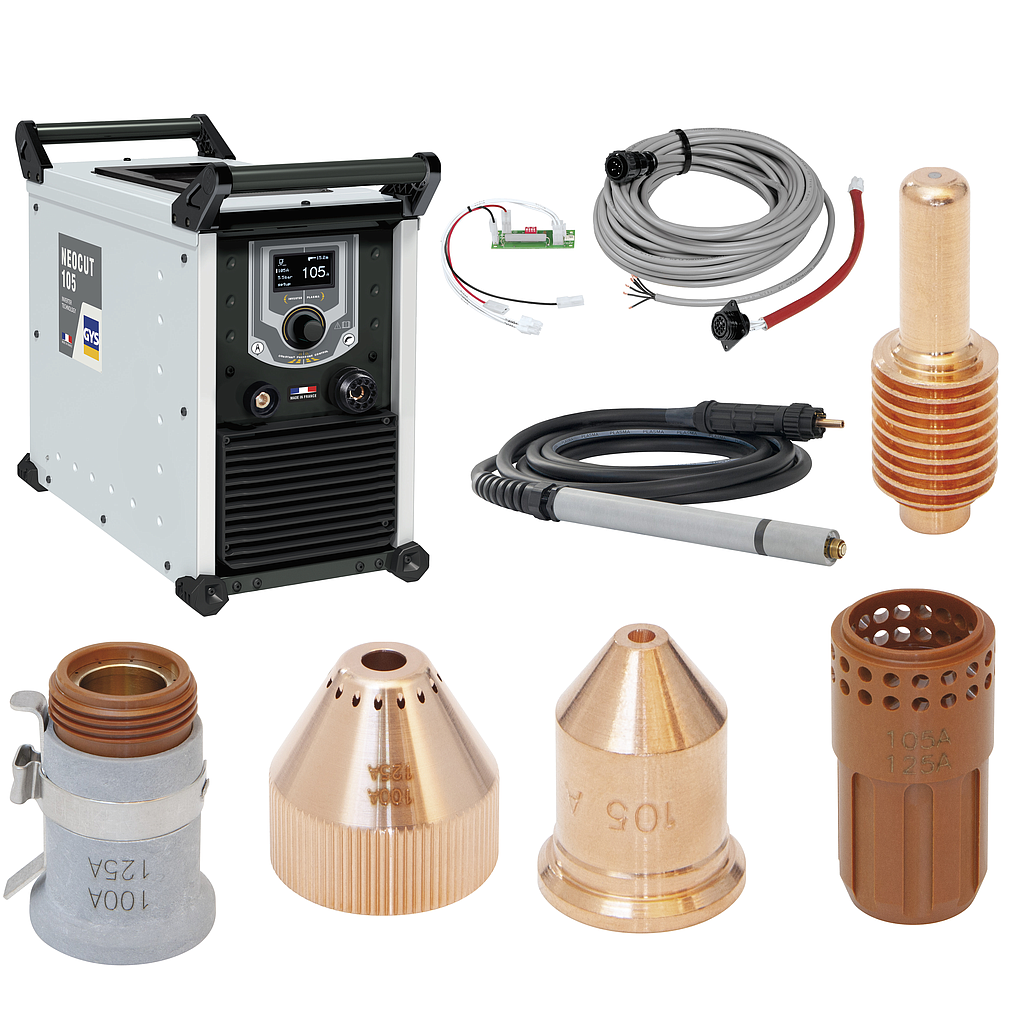 The NEOCUT 105 is a plasma cutter with a duty cycle of 100% at 105 A for cutting work up to 50 mm thick in industrial environments. It is equipped with automatic air pressure management, in all modes, offering optimum cutting quality throughout the lifespan of the consumables. Can also be connected to a cutting table, its «Marking» mode is perfect for tracing and identifying parts.