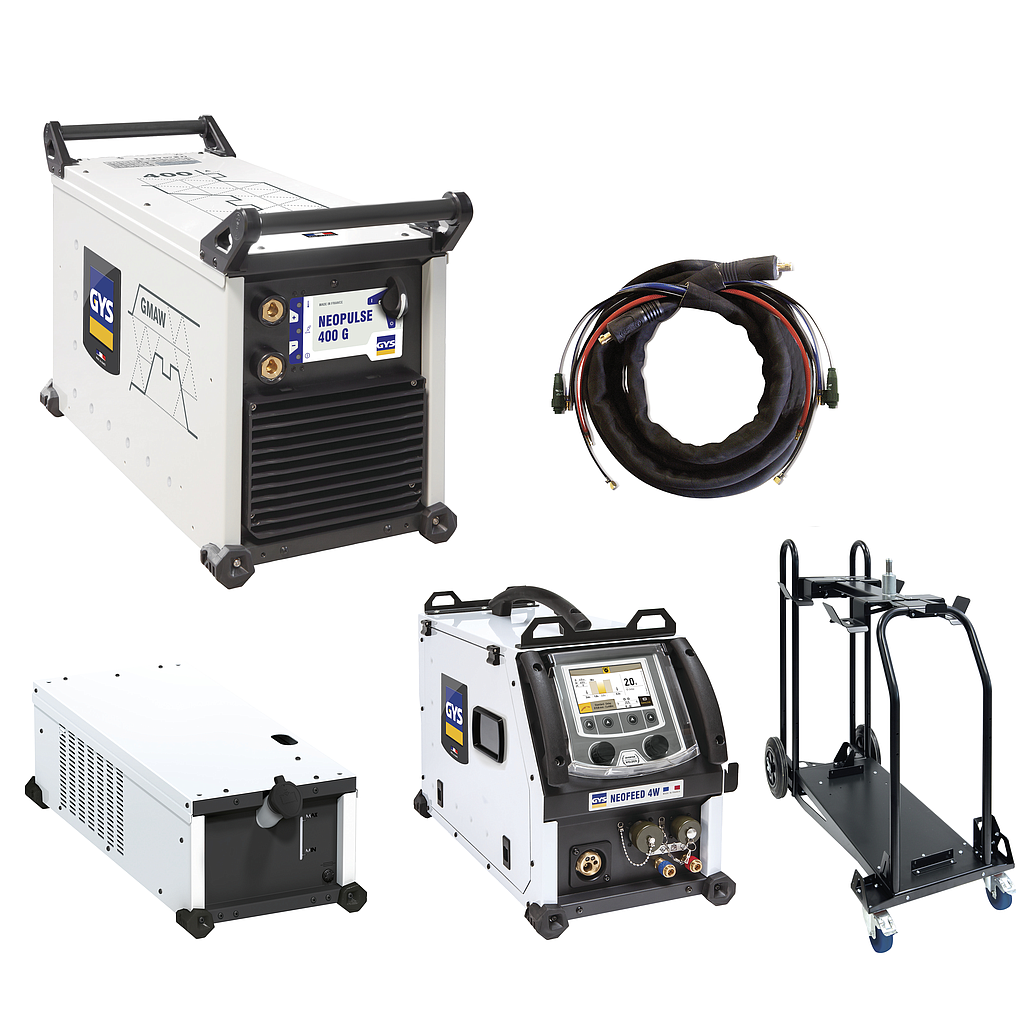 Digital technology, the NEOPULSE 400 G is a pulsed MIG/MAG welding power source with a separate wire feeder. Ultra high performance and designed for the highest performance level using the latest technology, it features +100 synergic curves and exceptional arc quality/performances. Intuitive and highly functional, its digital interface allows you to change welding parameters with ease. Equipped with its NEOFEED-4W reel (optional), this welding power source provides productivity and quality of unmatched welding on all types of alloys.