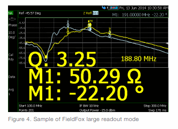 Using FieldFox’s large readout mode, the problem was easily solved. By changing the mode on the display, the technicians increased the display’s font size. This allowed them to easily see the readouts on the unit, even at a distance, as they repeatedly changed the properties of the RF coil (Figure 4). It also increased how quickly the technicians could make the measurements since they no longer had to run back and forth between the MRI machine and the instrument.
