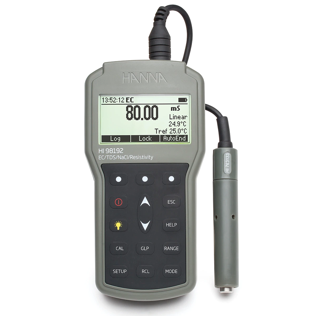 Ordering Information: HI98192 is supplied with HI763133 conductivity probe, HI7031M 1413 μS/cm calibration solution (230 mL), HI7035M 111.8 mS/cm calibration solution (230 mL), 100 mL plastic beaker (2), HI92000 PC software, HI920015 micro USB cable, 1.5V AA batteries (4), instruction manual, quick start guide, quality certificate and HI720192 rugged carrying case.