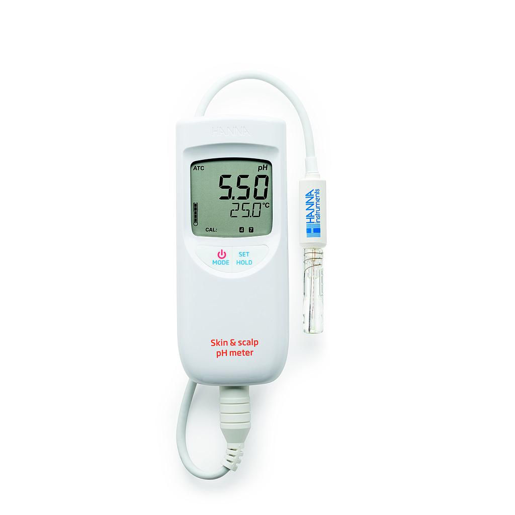Ordering Information: HI99181 is supplied with HI1414D/50 flat tipped pH/temperature probe, HI70004 pH 4.01 buffer solution sachet, HI70007 pH 7.01 buffer solution sachet, HI700620 electrode cleaning and disinfection solution for skin residuals sachets (2), HI700621 electrode cleaning solution for skin grease and sebum sachets (2), batteries, instruction manual, and hard carrying case.